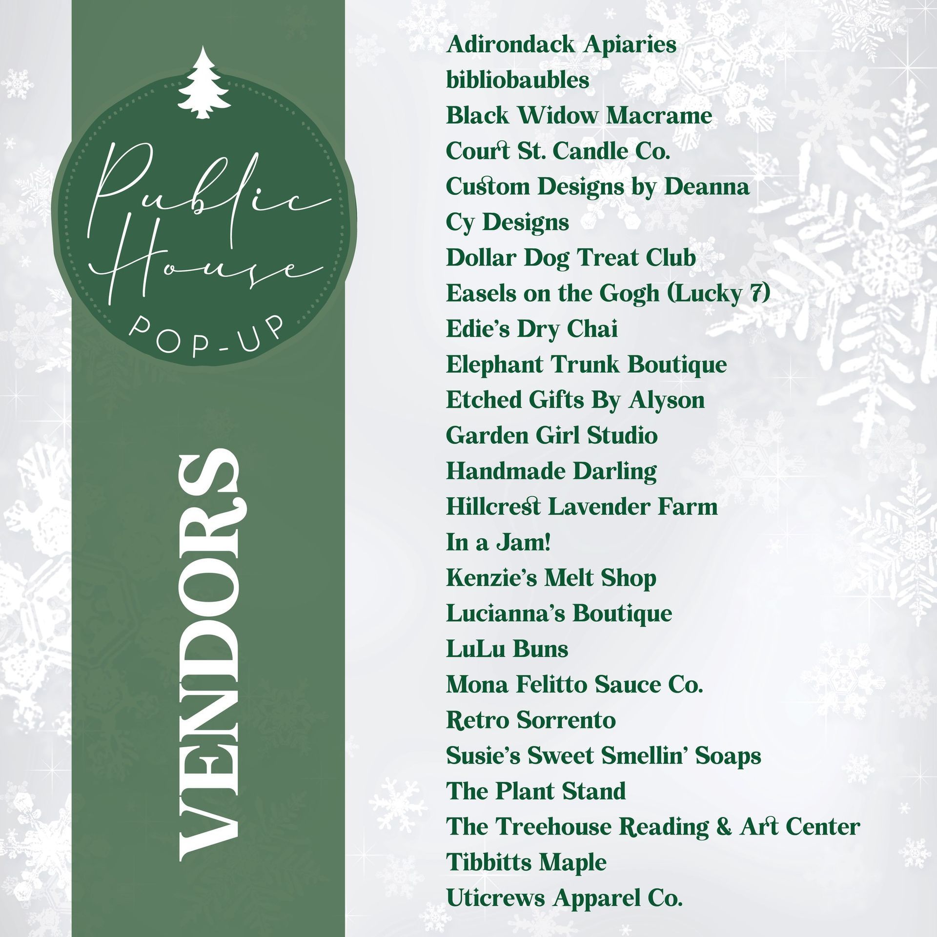 Kick off the holiday season at the annual Public House Pop-Up — a festive makers market featuring more than 25 local vendors, all under one cozy roof at Five Points Pub & Event Center inside the Irish Cultural Center (623 Columbia Street, Utica).